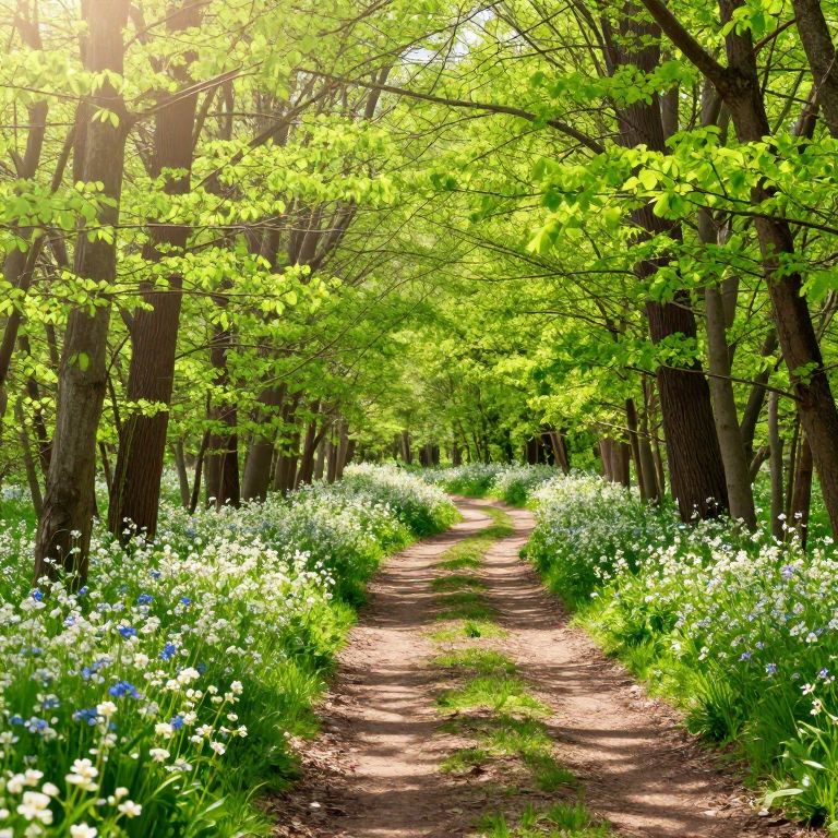 Lasy forest trail during spring, blooming wildflowers alongside dirt path, fresh green leaves on trees, sunlight dappling through branches, soft lens flare effect, hyper-detailed textures, realistic shadows, peaceful and refreshing vibe, digital art nature landscape