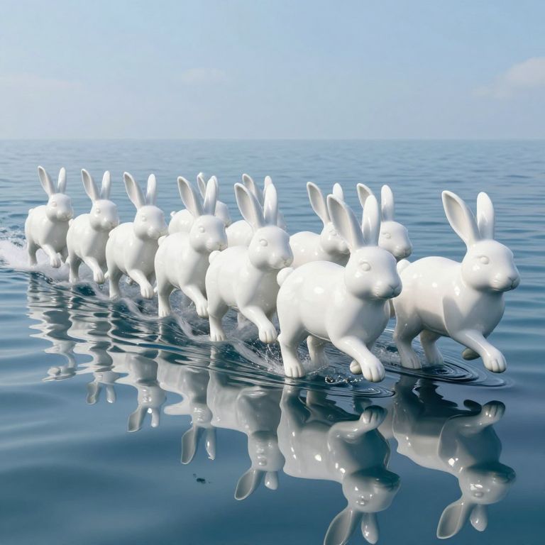 A computer-generated 3D render depicts an orderly procession of white rabbits galloping across a serene ocean, their ceramic-like forms casting perfect reflections on the mirrored surface below, as each step creates ripples that seem to unveil hidden narratives in the shimmering waves.
