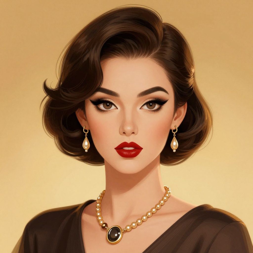 A vintage-inspired digital illustration of a woman with a classic 1920s aesthetic, featuring bold makeup, a bob haircut, and elegant accessories, rendered in a smooth, high-definition style against a warm, golden background.