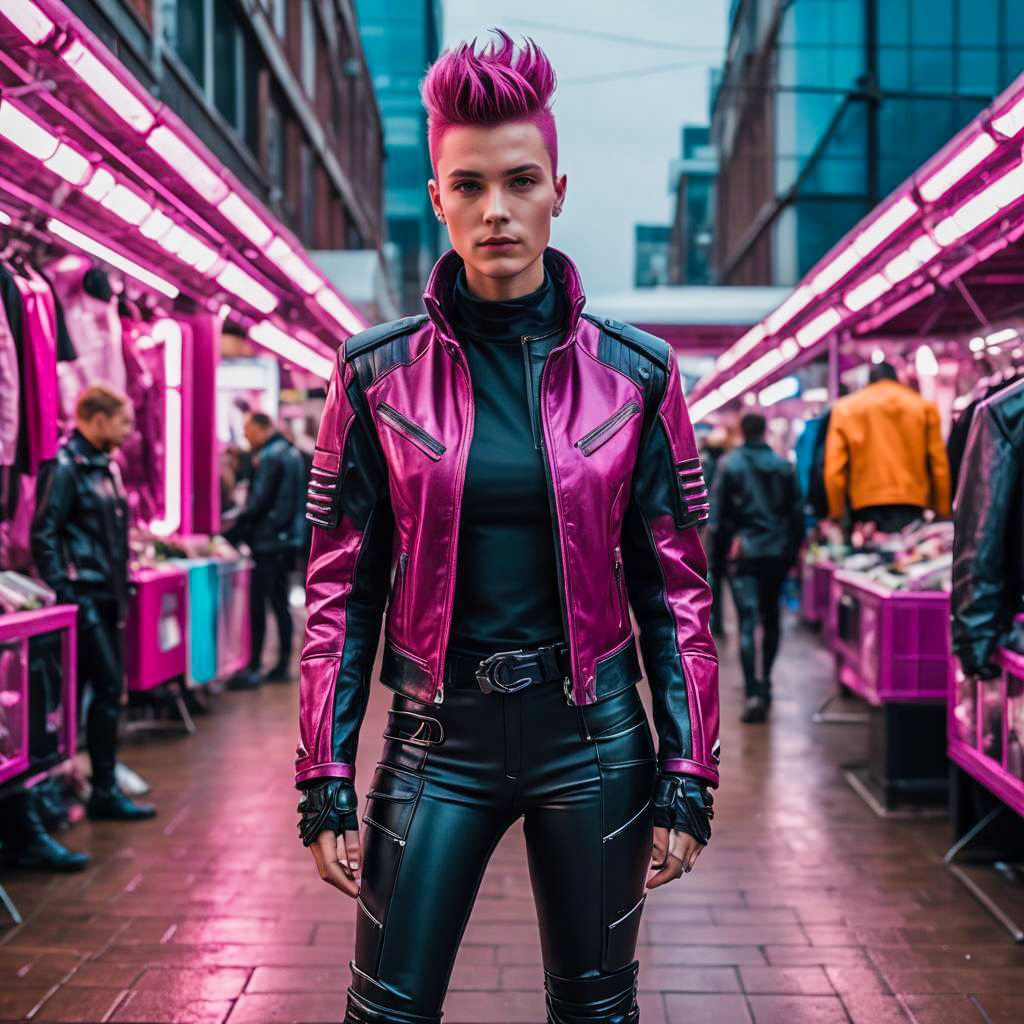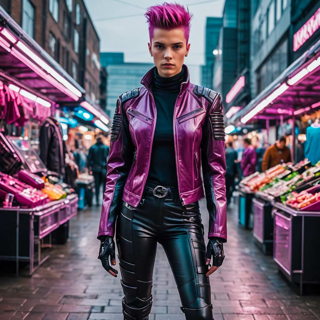 Photo of a Athletic person, Quiff, cyberpunk outfit, futuristic Amaranth leather jacket with PVC fabric accents, boots, outdoor market, jack daylight