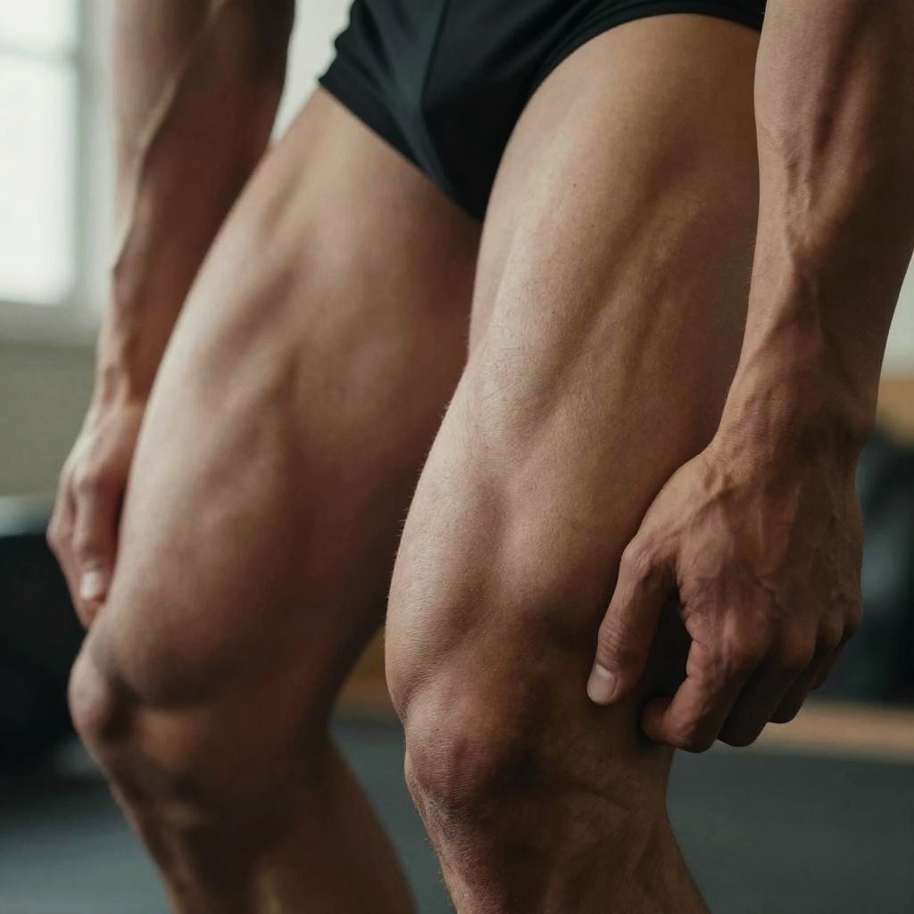 Gripping thighs, dramatic close-up, intense muscles flexing under soft natural light, detailed skin texture, cinematic depth of field, powerful and dynamic composition
