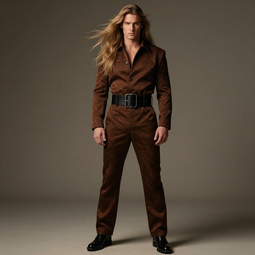A striking man with long, flowing blonde hair, embodying a rugged yet elegant look. He is wearing a richly textured brown outfit, cinched at the waist with a prominent black belt, and completing the ensemble with polished black shoes. Cinematic lighting, high detail, 8k, fashion photography.