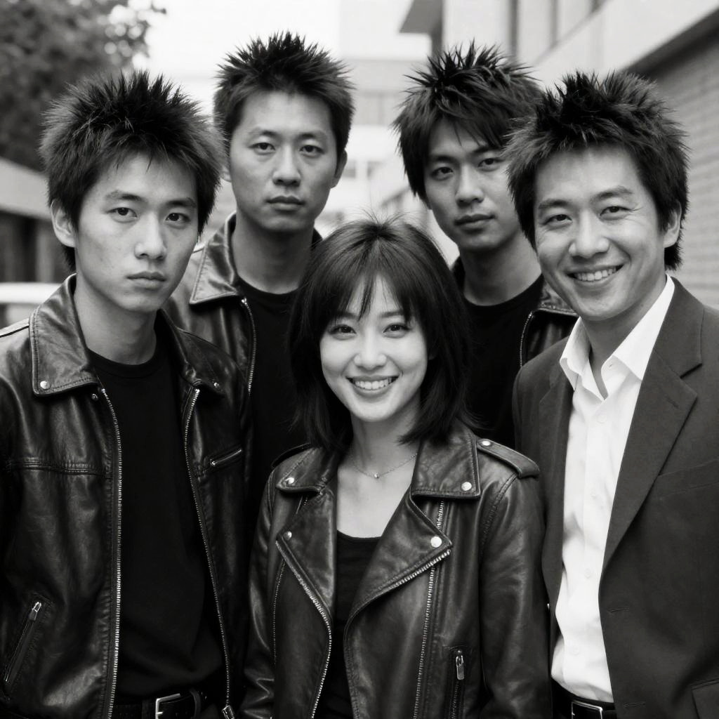 Black and white photograph of four people with spiky hair. Three men in leather jackets, one in a suit. Smiling woman in the center, man on the left looks serious, man on the right smiles. Urban background.