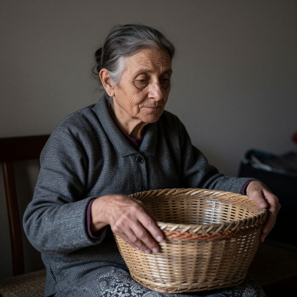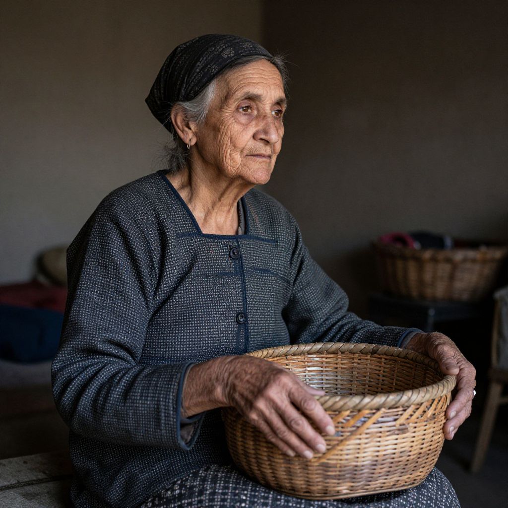 An elderly woman cradles a woven basket, her weathered hands and solemn gaze embodying the weight of memory and the quiet resilience of a life lived, as the soft texture of her attire and the muted tones of the room evoke a poignant sense of timelessness and introspection.
