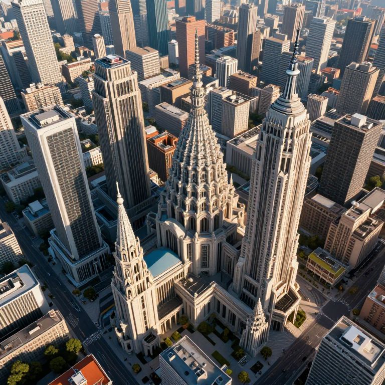 Aerial photograph of a dense cityscape featuring Gothic-style cathedral with twin spires, surrounded by modern skyscrapers, bathed in sunlight.