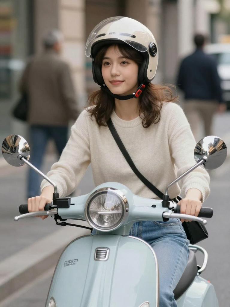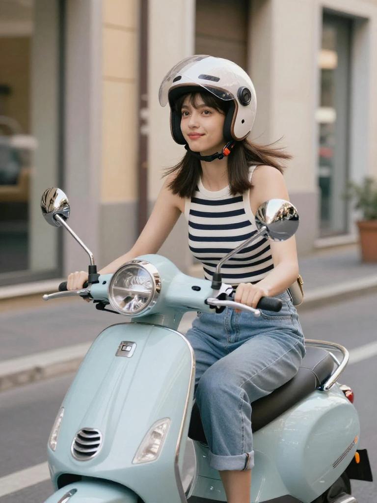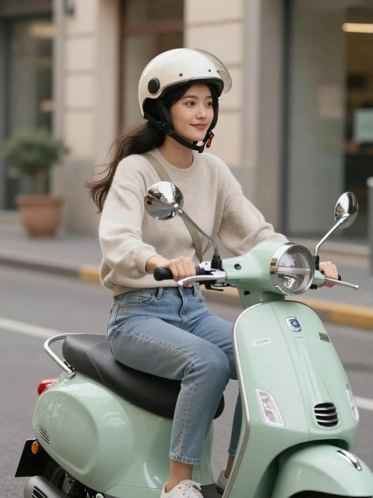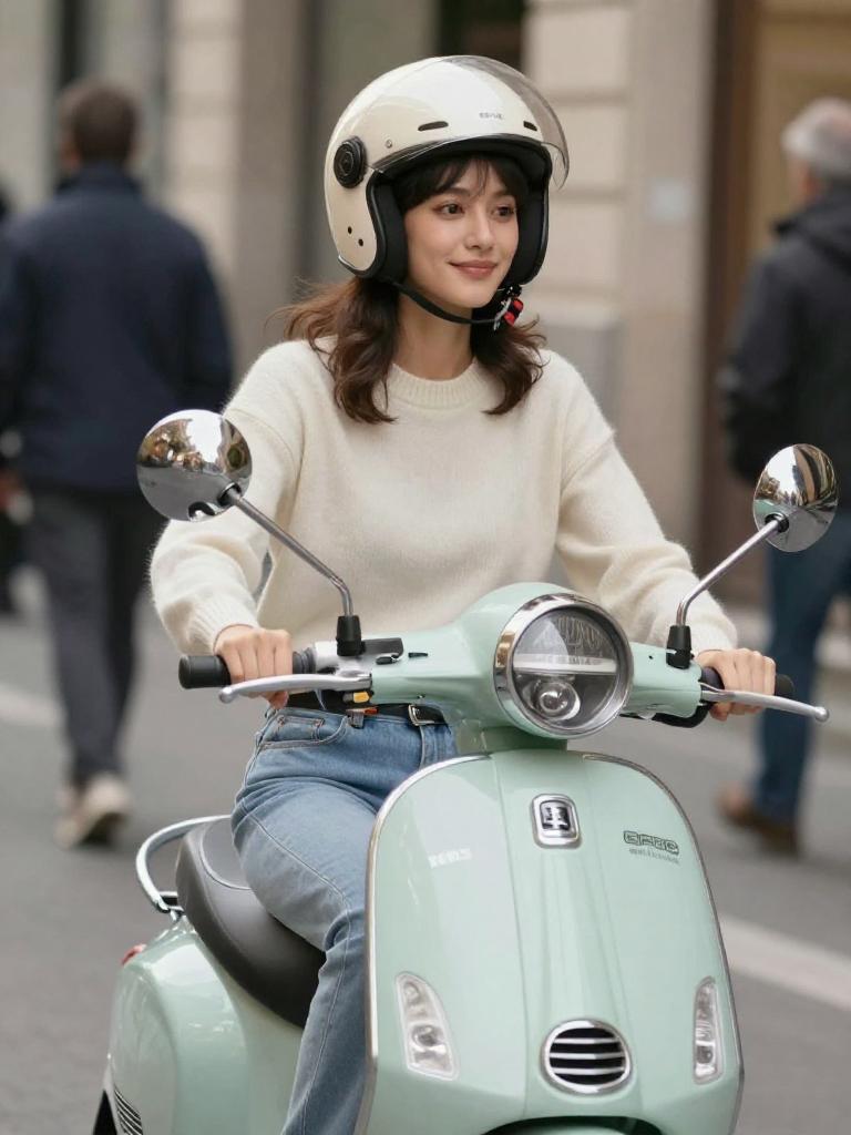 Italian woman driving a scooter, smiling woman with light brown hair in a loose ponytail in simple sweater and light blue jeans riding a mint green scooter, white open-face helmet on her head, focused but happy expression, quiet business district street daytime scene, lifestyle stock photo, natural lighting, high resolution