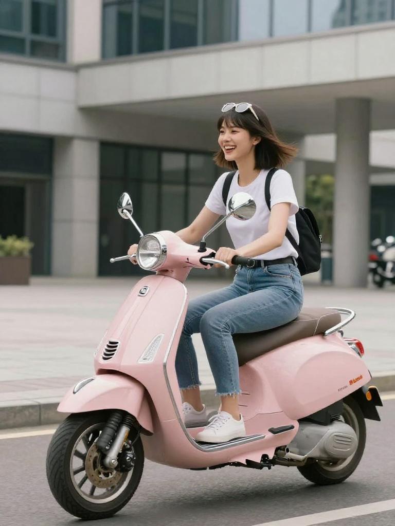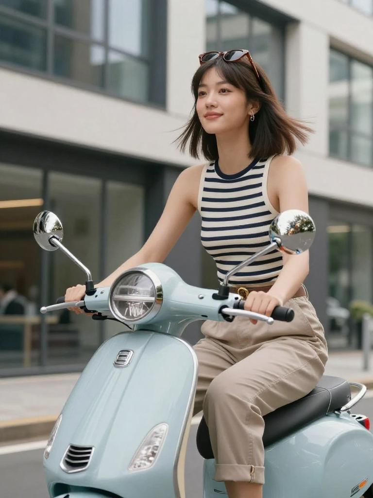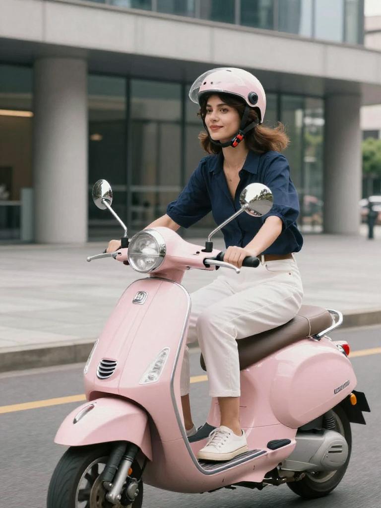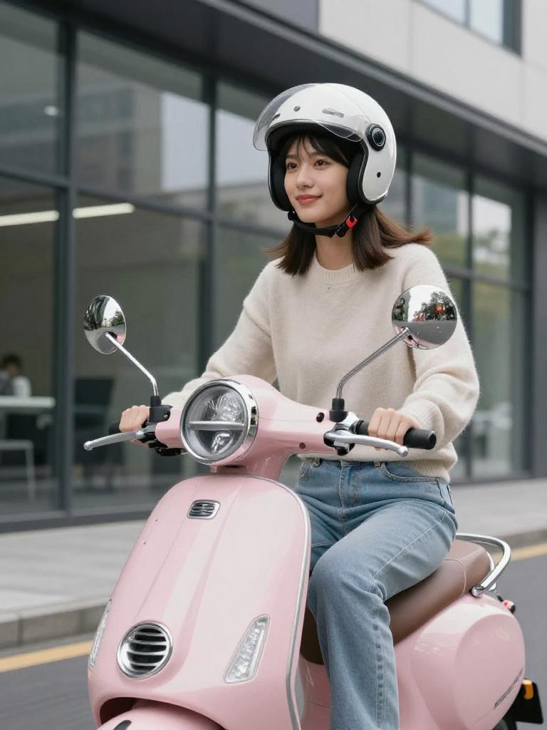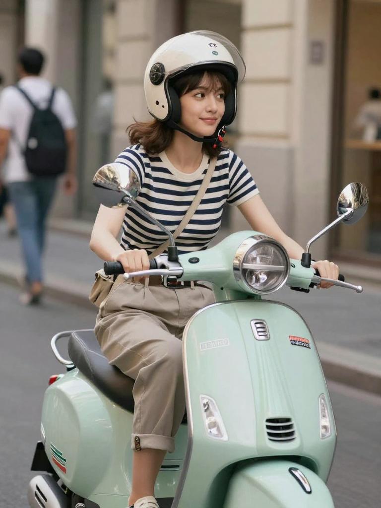 Italian woman driving a scooter, smiling woman with light brown hair in a loose ponytail in simple sweater and light blue jeans riding a mint green scooter, white open-face helmet on her head, focused but happy expression, quiet business district street daytime scene, lifestyle stock photo, natural lighting, high resolution