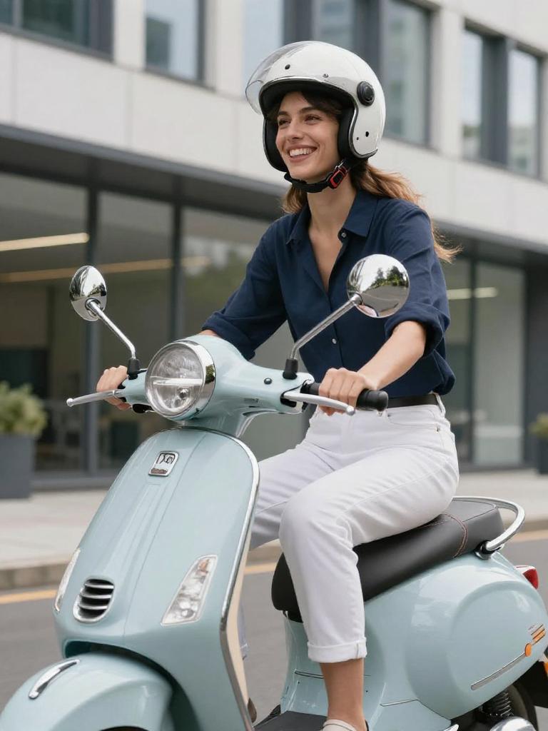 Smiling Italian woman with light brown hair tied in a loose ponytail, wearing a white open-face helmet, simple white sweater, and light blue jeans, riding a mint green scooter on a quiet daytime city street in a business district.