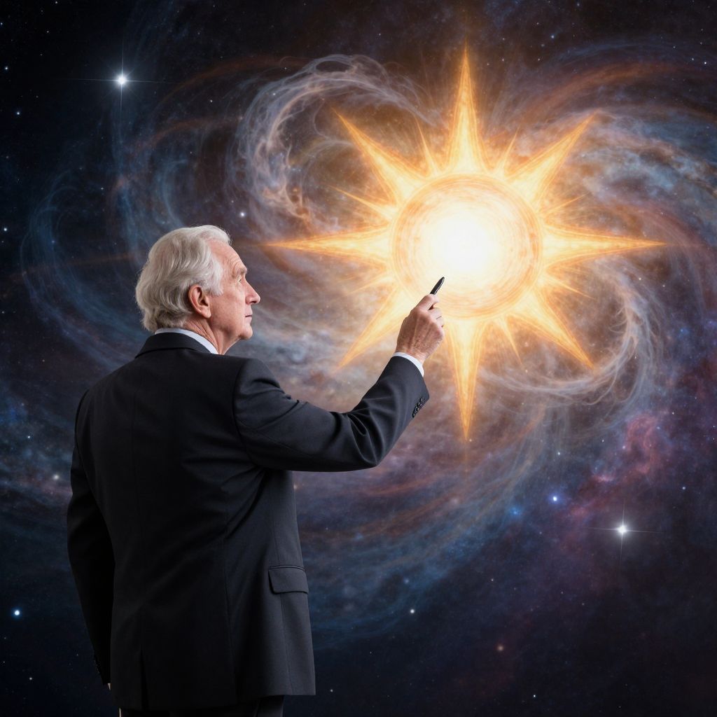 Elderly man in a suit stands against a cosmic backdrop, pointing his pen toward a radiant sunburst surrounded by swirling clouds and starry nebulae, as if sketching the universe's mysteries into existence.