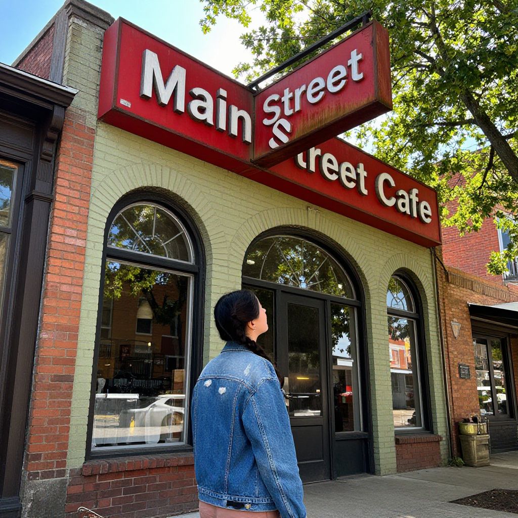 Photograph of a woman in a blue denim jacket standing outside the "Main Street Sweet Cafe" with red sign, brick building, and arched windows