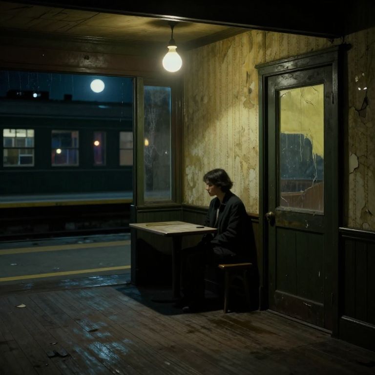 Imagine a serene yet haunting scene evoking the same sentiment as Hopper's nocturnal masterpieces. In this setting, a lone individual sits at a dimly lit table in a small room, reminiscent of an abandoned train station with its peeling wallpaper and aged wooden floorboards. A solitary flickering bulb overhead casts dramatic shadows across the figure's face while highlighting their solitude. Through the slightly ajar door, a glimpse into the next car reveals a desolate platform bathed in moonlight, further enhancing the melancholic atmosphere. The soft glow of distant streetlights filtering through grime-coated windows creates an ethereal ambiance that encapsulates the eerie beauty of abandonment and solitude.