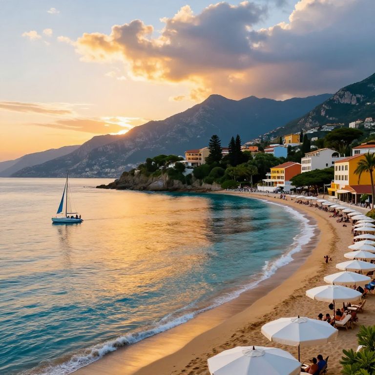 Sunset bathes a vibrant coastal scene with golden hues reflecting off the azure waters, where sailboats glide near a sandy beach lined with white umbrellas and dotted with people enjoying the serene ambiance, while colorful buildings and lush greenery rise against the backdrop of majestic mountains under a sky painted with soft clouds.