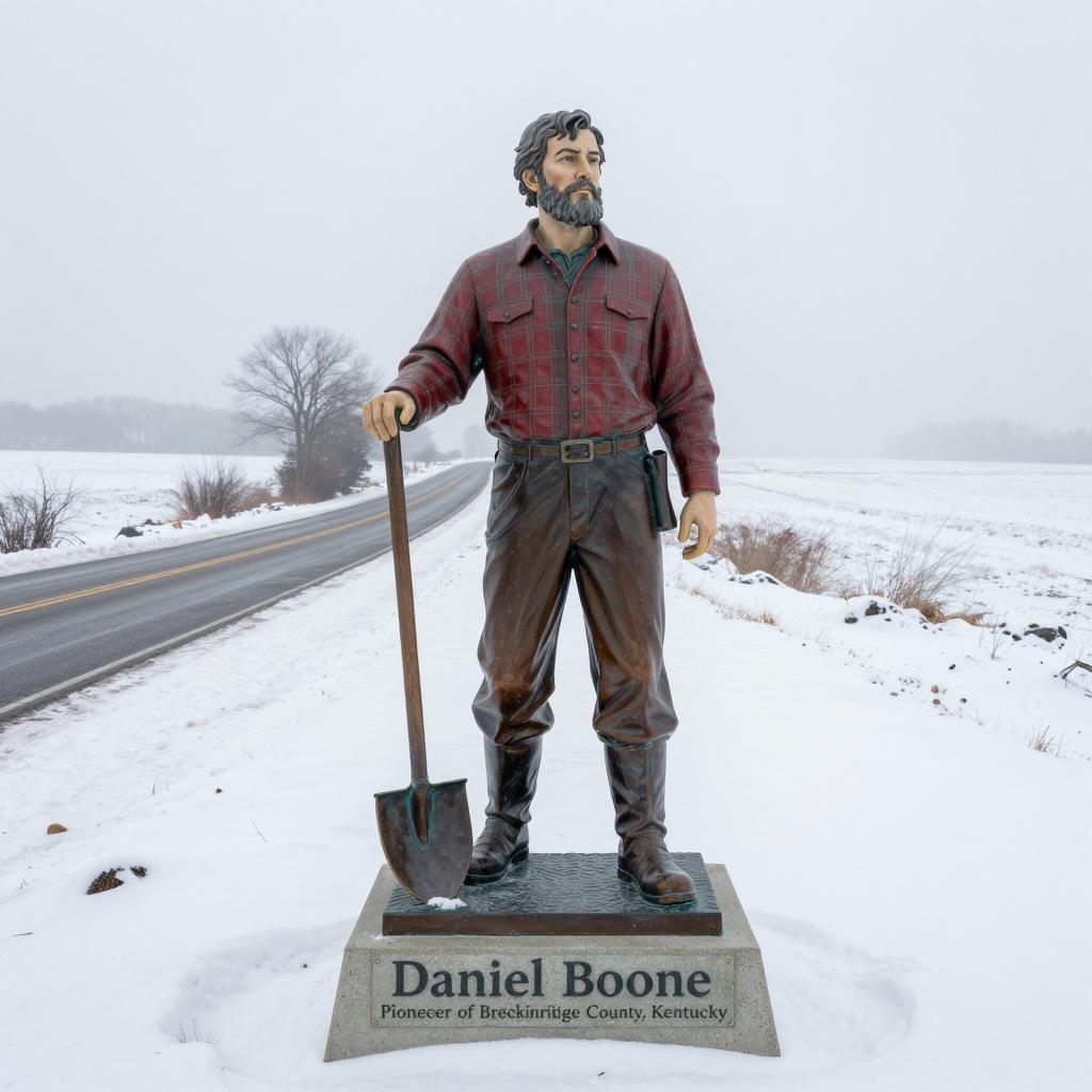 A statue of a bearded man in a red plaid shirt, dark pants, and boots, holding a shovel. He stands on a concrete base labeled "Daniel Boone, Pioneer of Breckinridge County, Kentucky." The statue is on a snow-covered road that extends into a foggy, snow-covered landscape.