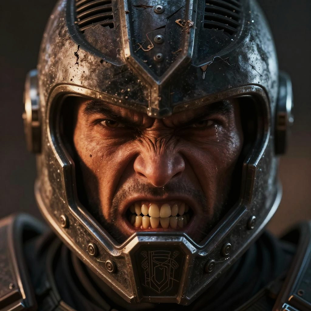 Extreme close up on the helmet of the doom slayer, broken doom slayer helmet, photorealistic, doom slayer, doom eternal, raging face of the doom slayer