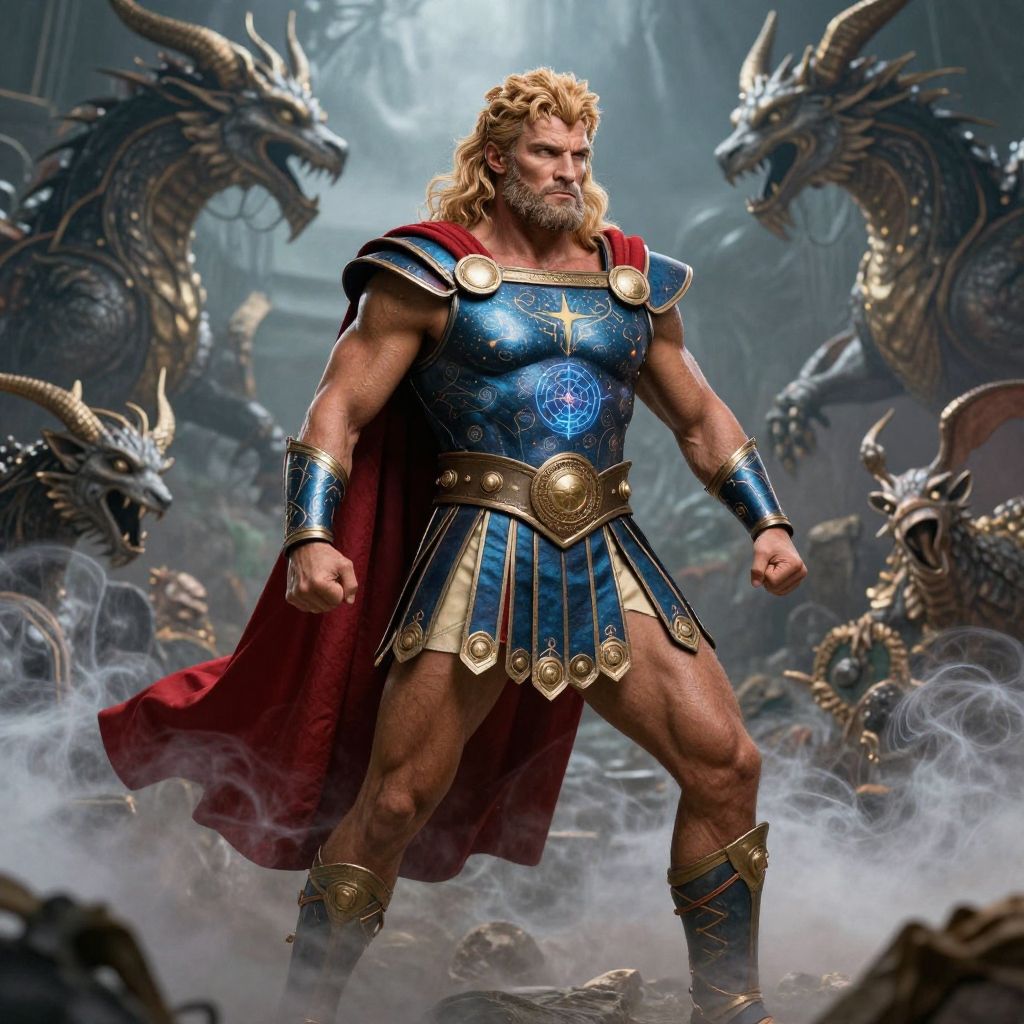 Muses Hercules costume with a fantasy twist, blending traditional Greek warrior attire with vibrant colors and magical symbols, highlighting strong, heroic features and a dynamic pose surrounded by swirling mist and mythical creatures.
