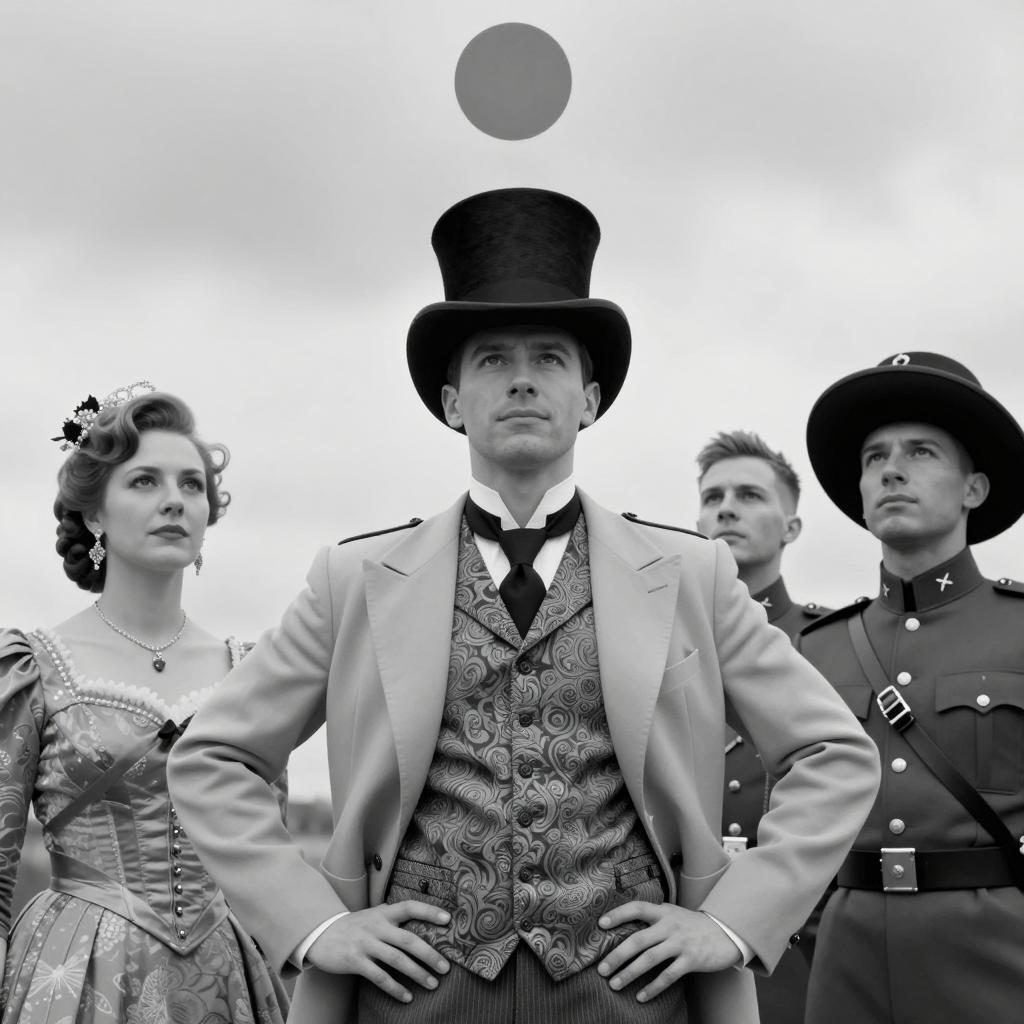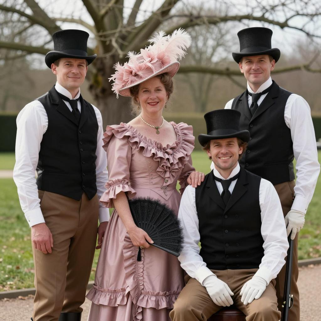 Photograph of six people. Primary subject: man in black suit, gray vest, white shirt, black tie, white flower, smiling, arm around woman. Woman wears black frilled hat, red jacket, black skirt, smiling. Confetti around them. Background: five people in similar formal attire, including gray top hats, colorful dresses, holding hats. Man with gray vest and white shirt on left, others on right. Woman in orange dress with curly red hair on far right. White background.