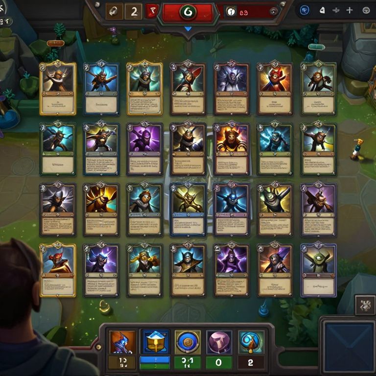Over-The-Shoulder Shot fantasy card game, grid of cards in the middle, UI, magic the gathering style, hearthstone style, league of legends style, game screenshot,
