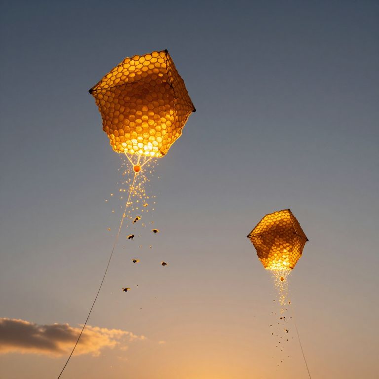 Floating honeycombs anchored by tethered kites release golden light as bees made of stardust dart through the glow of inverted twilight.