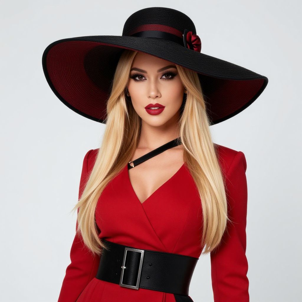 Woman with long blonde hair wearing a purple dress and a purple hat.