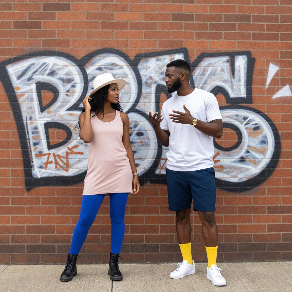 Photograph of two people standing in front of a brick wall with white graffiti. Woman on left wears white hat, pink dress, blue leggings, black boots, and touches her hair. Man on right wears white shirt, blue shorts, yellow socks, white sneakers, and gestures with his hands. Both have dark skin.