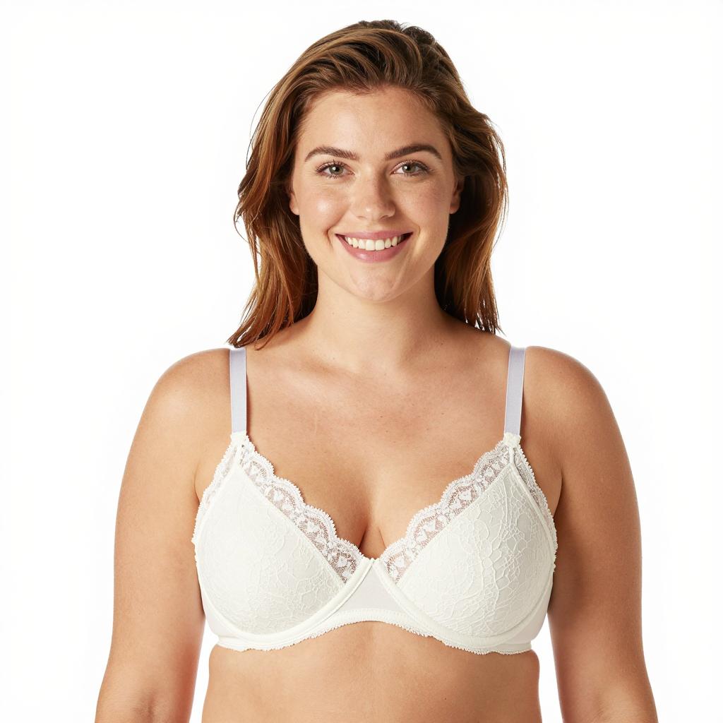 Woman with light brown hair, smiling, wearing white lace-trimmed bra, medium-large breasts, light skin, white background, standing, frontal view.