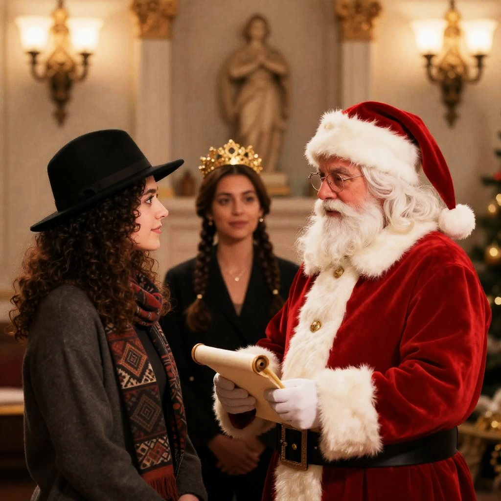 Photograph of Santa Claus with white beard and red velvet coat, holding a scroll, standing beside a young woman with curly hair in a black hat and patterned scarf, and a woman with braided hair and gold crown. Ornate, warm-toned background with statues and wall sconces. Santa and curly-haired woman facing each other, third woman facing Santa.