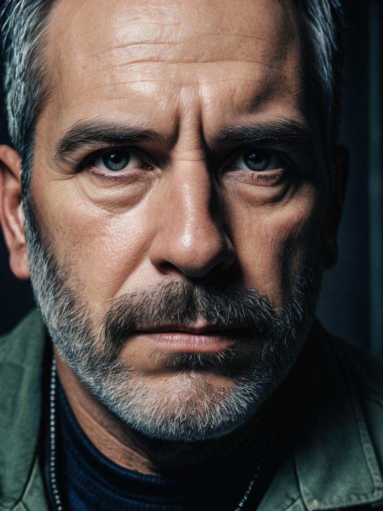 Photorealistic close-up headshot of a mature Caucasian man with gray hair and a full gray beard. The man has a serious expression with deep-set eyes and visible wrinkles on his forehead. He is wearing a dark blue shirt with a white jacket over it, set against a dark, blurred background.