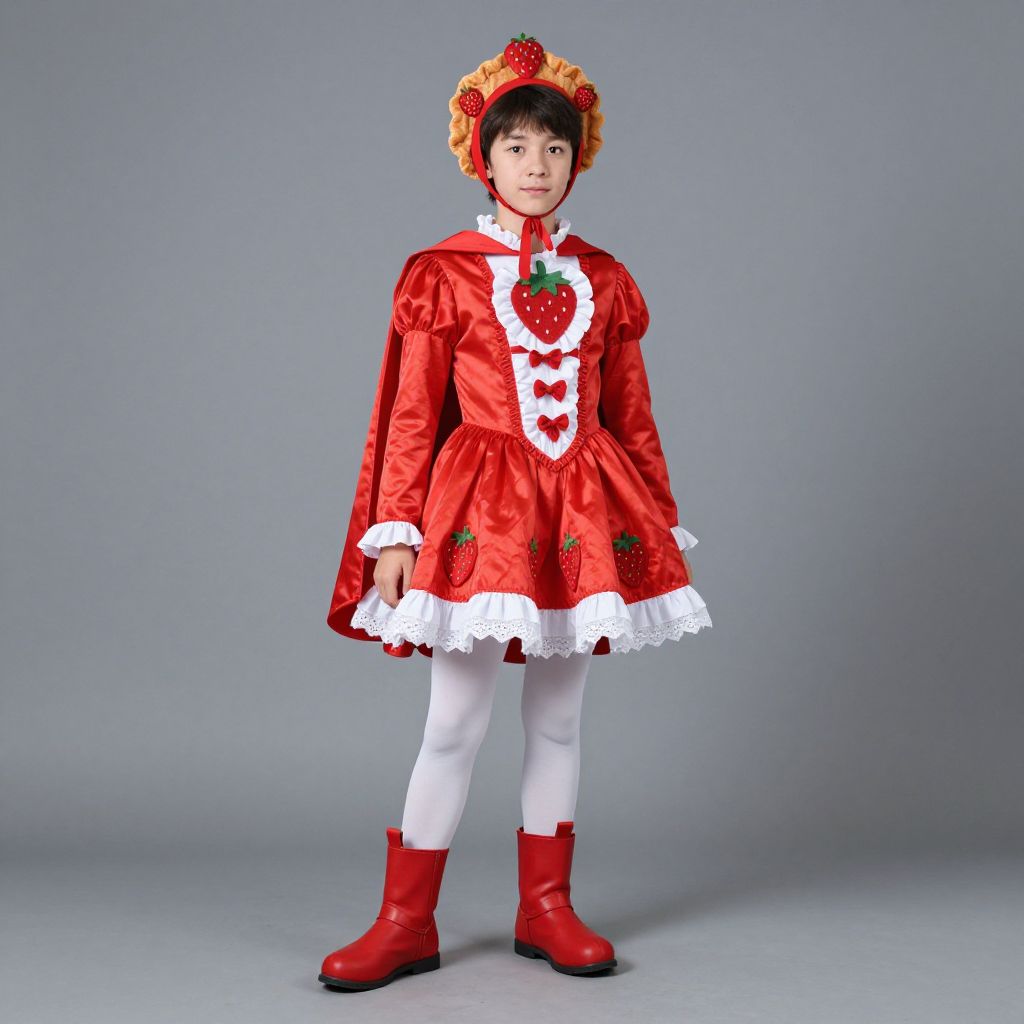 Strawberry tart costume, 1boy, male focus, hat, solo, red footwear, pantyhose, dress, full body, red headwear, standing, cape, boots, looking at viewer, frills, parody, white pantyhose, flower, red dress, long sleeves
