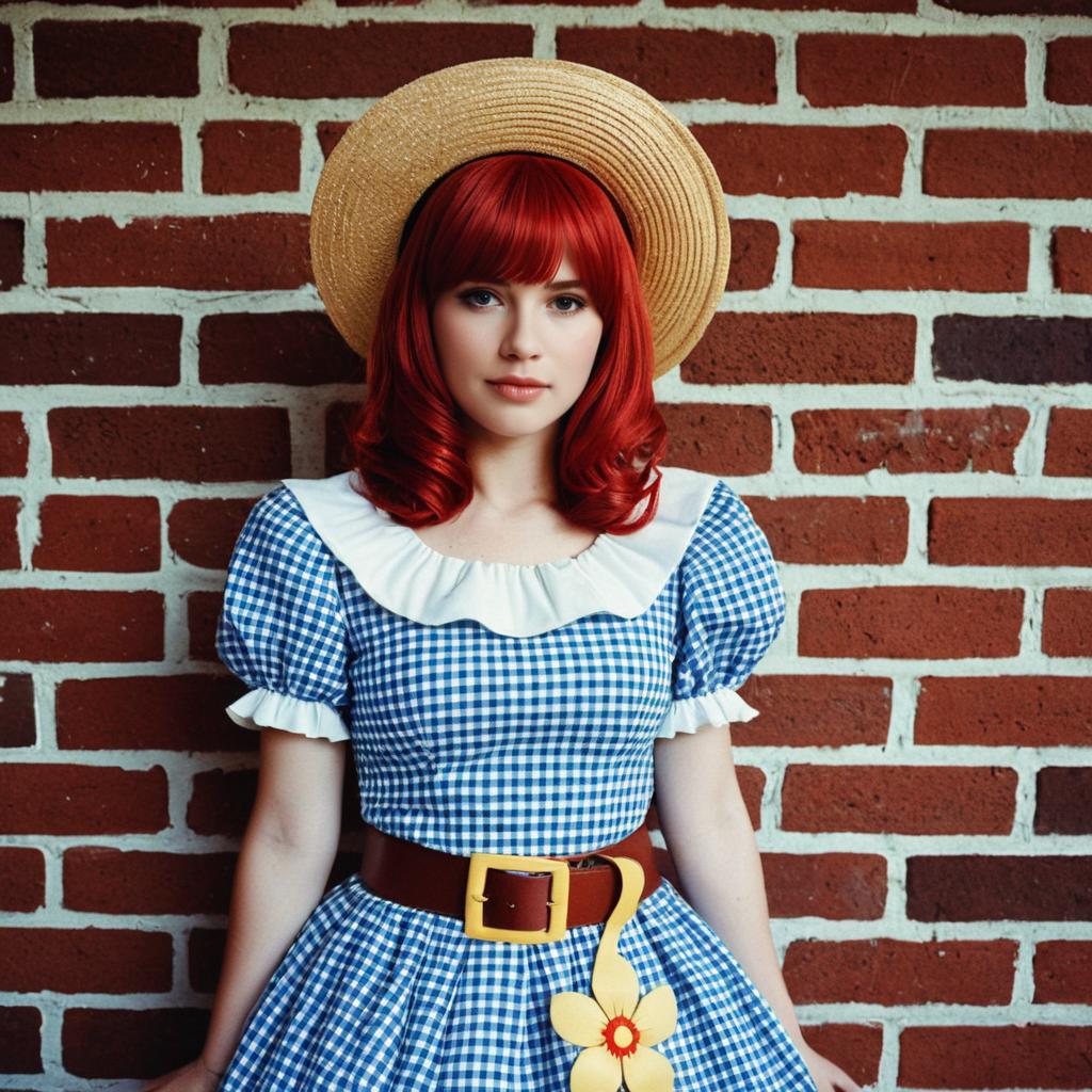 Woody jessie costume fancy,1girl, solo, dress, red hair, hat, realistic, brick wall, multicolored clothes, belt, short sleeves, flower, looking at viewer, hair ornament, puffy sleeves