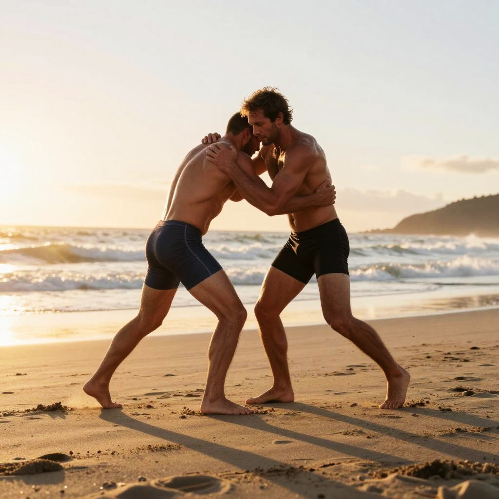 Jeff Seid wrestling outdoors on a sandy beach at sunset, golden hour light casting long shadows, muscular physique and athletic pose mid-grapple, natural scenery with waves and sky in the background, hyper-realistic with warm tones and detailed textures.