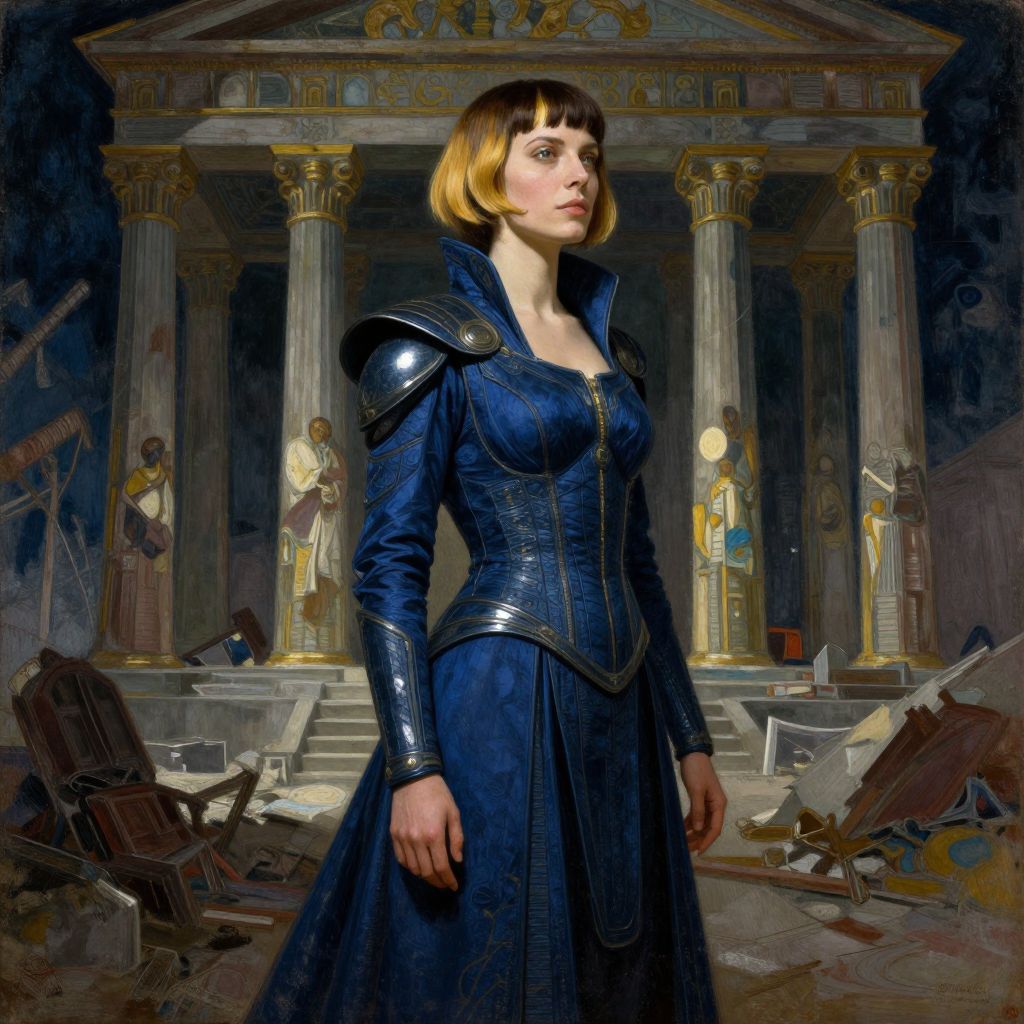 Digital artwork of a blonde woman in a dark blue, long-sleeved, military-style coat standing in front of ancient, weathered columns in a