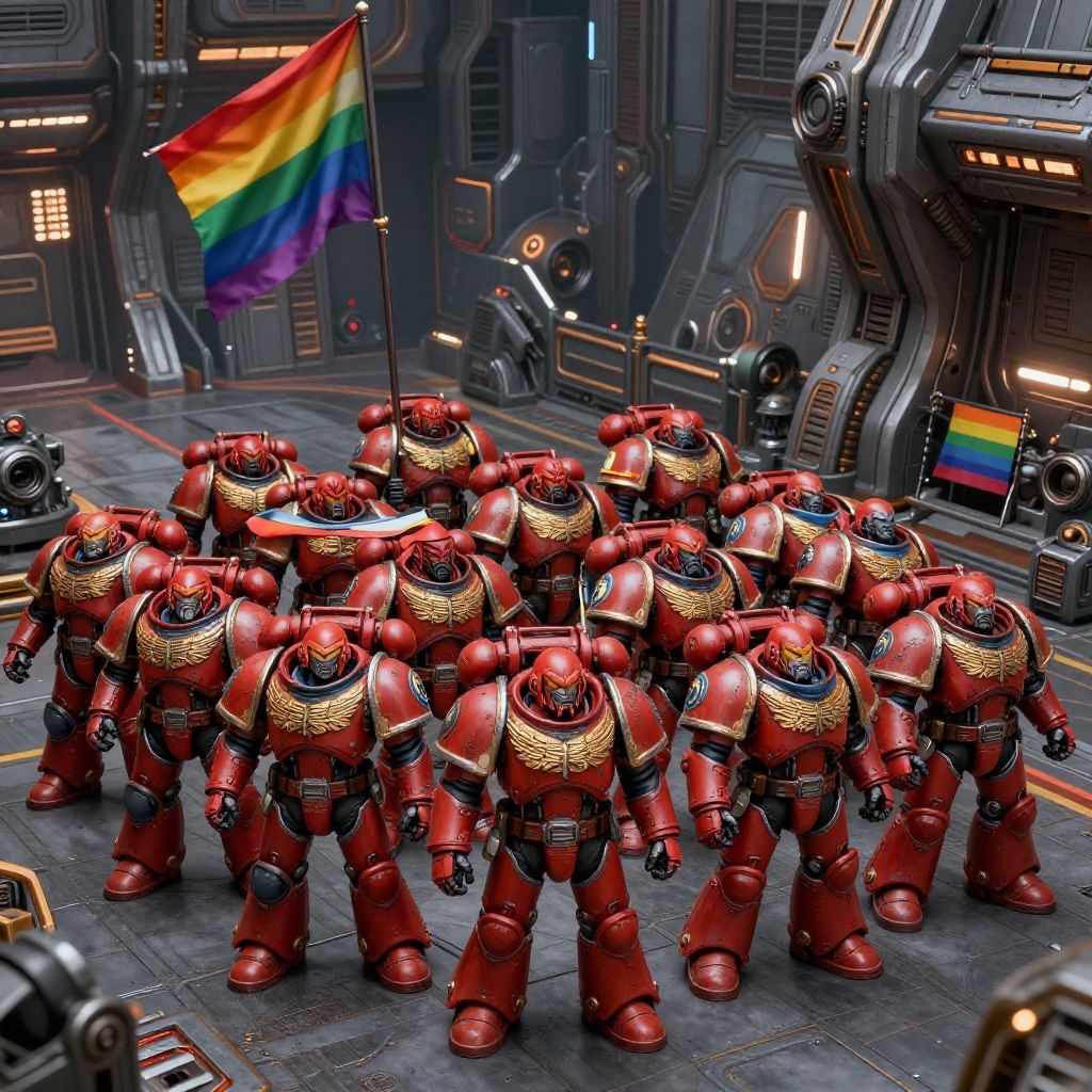 Photorealistic CGI of a group of red, golden-accented robotic soldiers holding a rainbow flag in a futuristic, metallic spaceship interior.