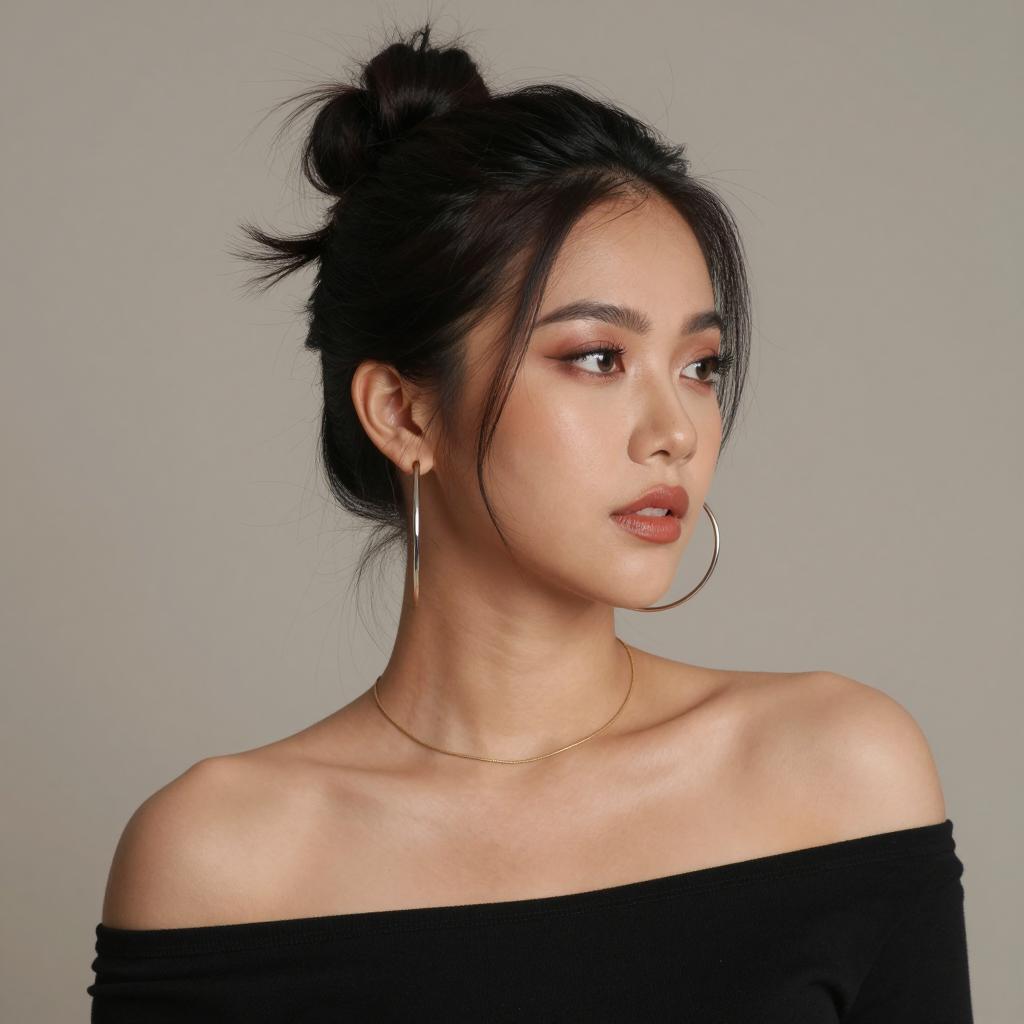 Asian woman with medium skin tone, black hair in a bun, wearing a backless pink dress with a large red bow at the lower back, holding a glass of red wine in her right hand. Standing in front of white curtains, looking over her right shoulder. Background: white curtains.