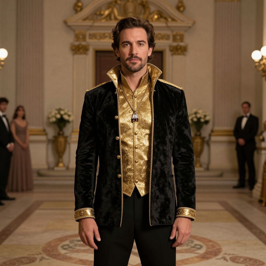 Photograph of a handsome, middle-aged man with wavy brown hair and a trimmed beard, standing in an opulent, ornate room. He wears a black velvet jacket with gold trim and intricate gold patterns over a black shirt, paired with black pants. His expression is serious. The background features a grand, gold-accented door, tall columns, and two standing men in black suits with one woman in a brown dress. The floor has a decorative, circular pattern. The lighting is warm, highlighting the luxurious setting. The image has a polished, fashion-show style.
