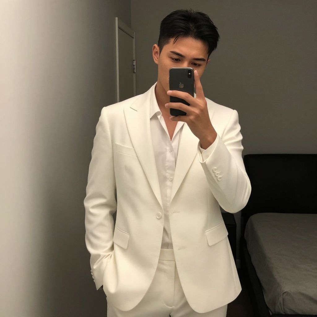 Photograph of an Asian man with short, black hair, standing in a minimalistic room. He is taking a mirror selfie with a black smartphone, partially obscuring his face. He wears a sharp, white, tailored suit with a crisp white shirt underneath. The suit has a single buttoned jacket and two flapped pockets. The background features a gray wall and a dark gray bed on the right side. The lighting is bright, highlighting the white suit against the darker background. The man's skin tone is light, and his expression is neutral.