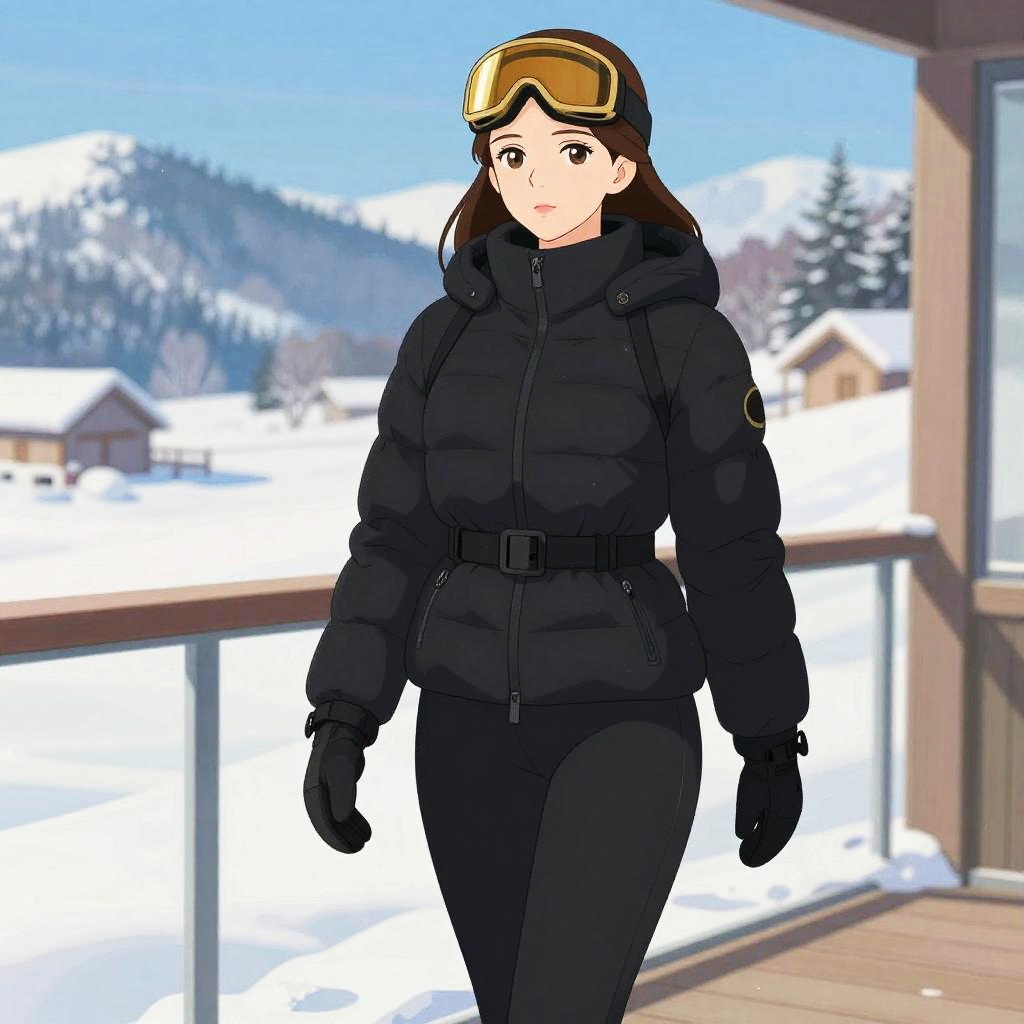 A curvy woman in sporty winter chic, wearing a black puffer jacket with a belted waist, high stand-up collar, and fitted black ski pants, accessorized with black ski gloves and gold ski goggles, stands on a terrace facing a snowy landscape, illustrated in the style of Toei Animation. Sexy. Pretty face and beutiful eyes