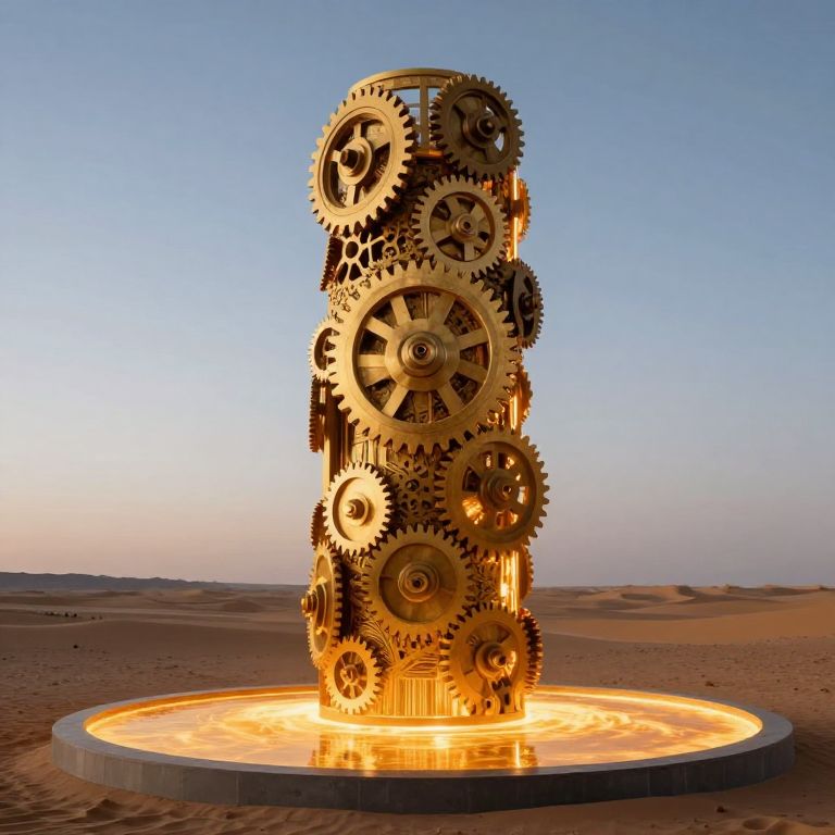 Photograph of a tall, cylindrical sculpture composed of various-sized golden gears, standing in a desert with a clear, blue sky. The gears are illuminated from below, casting a warm, glowing light. The sculpture is centered on a circular, glowing platform that contrasts with the sandy, barren landscape. The gears have intricate, metallic textures, and the overall composition exudes a steampunk aesthetic. The desert extends into the horizon, adding a sense of isolation and scale to the image.