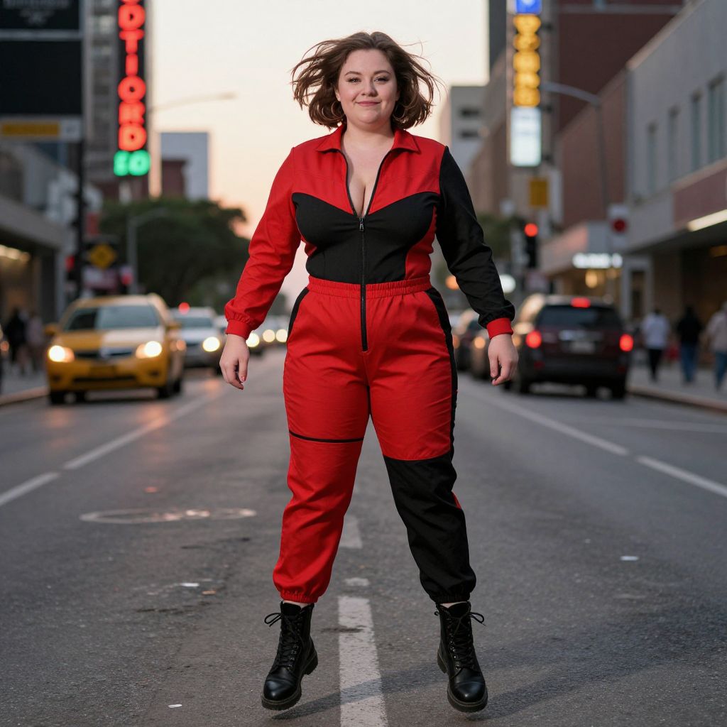 A realistic photograph of a plus-size woman with a vibrant, dynamic racer jumpsuit, featuring a bold red and black design with zippered panels and elastic waistband, standing on a gritty city street at sunset, her face bright and joyful with a slight smirk, wind blowing through her hair as she jumps into the air mid-motion, wearing bold combat-style boots, urban background with traffic and neon signage. The woman has big breasts and cute face