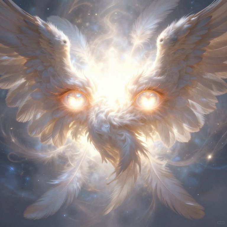 Digital art: radiant white angel with glowing eyes and outstretched wings, surrounded by ethereal feathers and a starry, cosmic background.