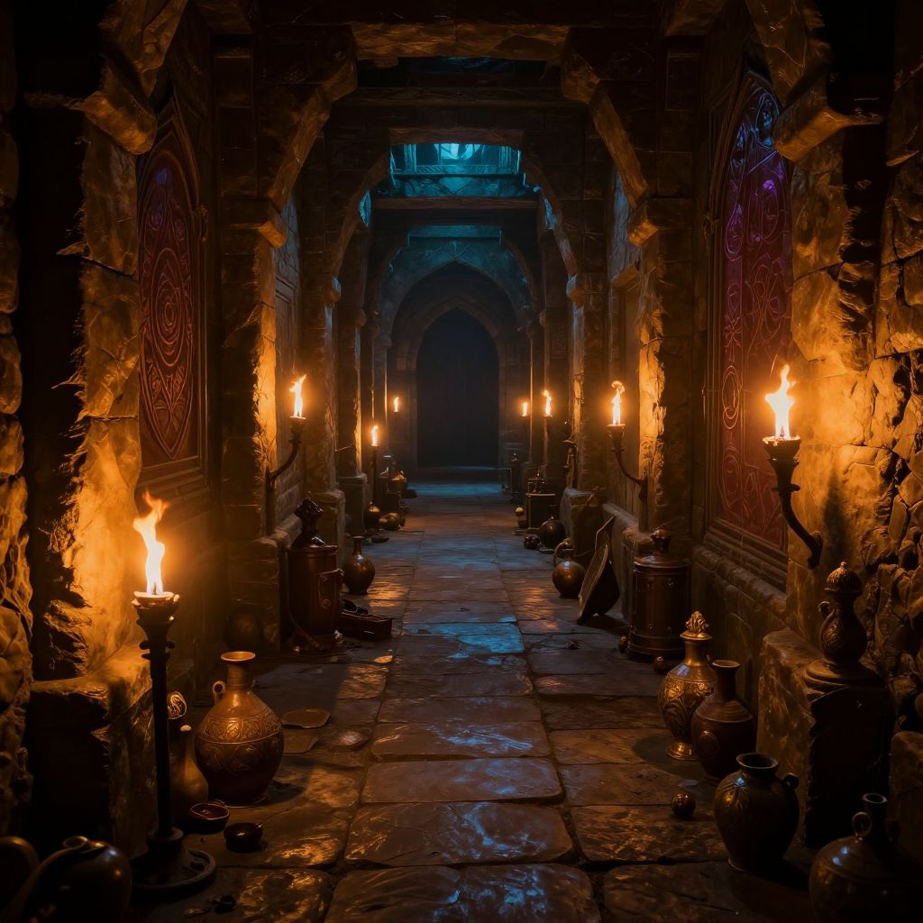 Fantasy dungeon art of a narrow stone corridor filled with traps and magical barriers, flickering torchlight creating deep shadows, ancient potions and relics scattered on the floor, a sense of danger and mysticism, beautifully detailed with vibrant fantasy color palette