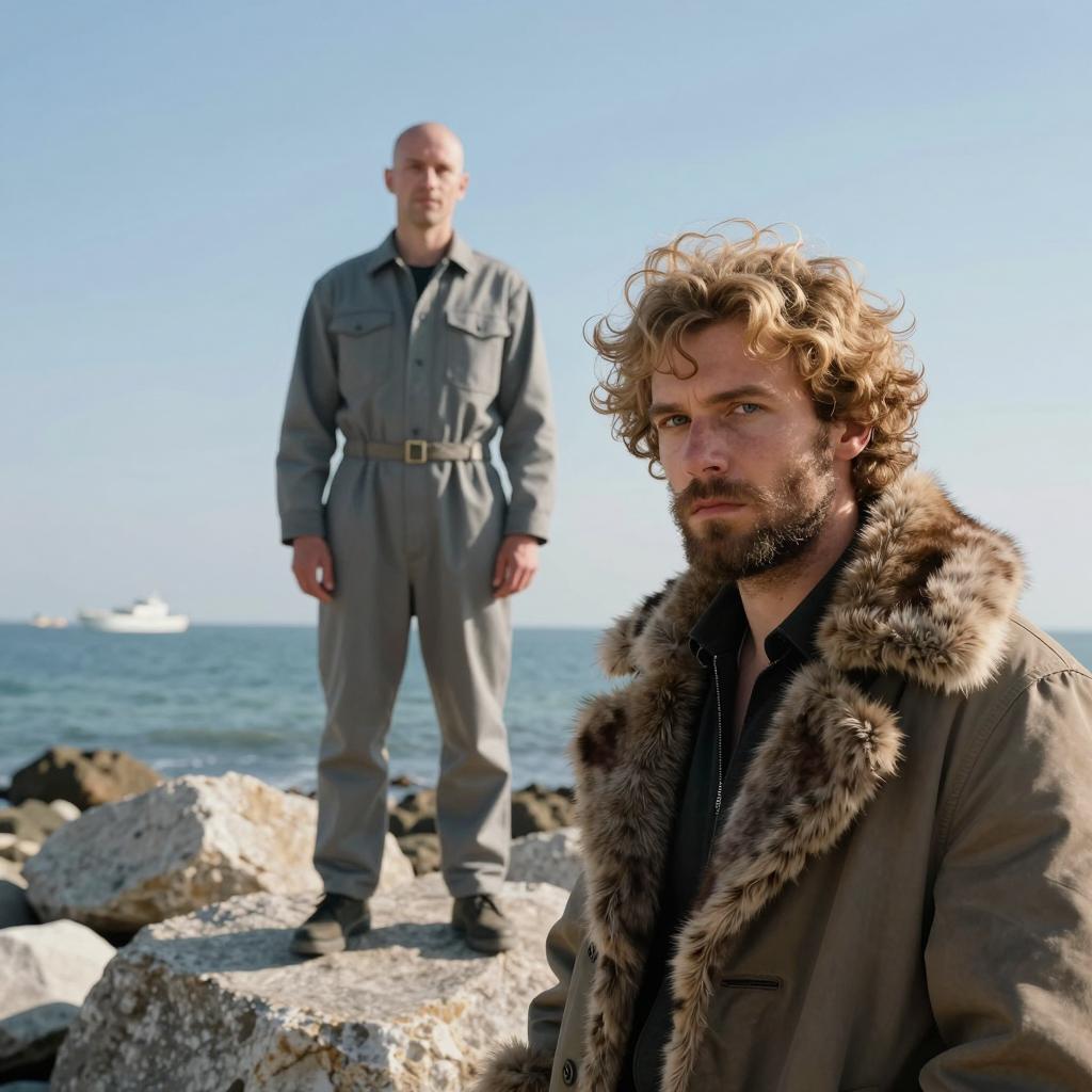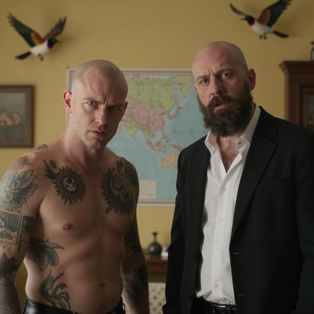 Photograph of two bald, tattooed men sitting on a bed. The left man wears a white tank top with red suspenders, his arm tattooed, mouth slightly open. The right man is shirtless, with a star tattoo on his chest and plaid blanket covering his lower body. Background features a red wall and a large, black and white cross flag. Both men have intense expressions.