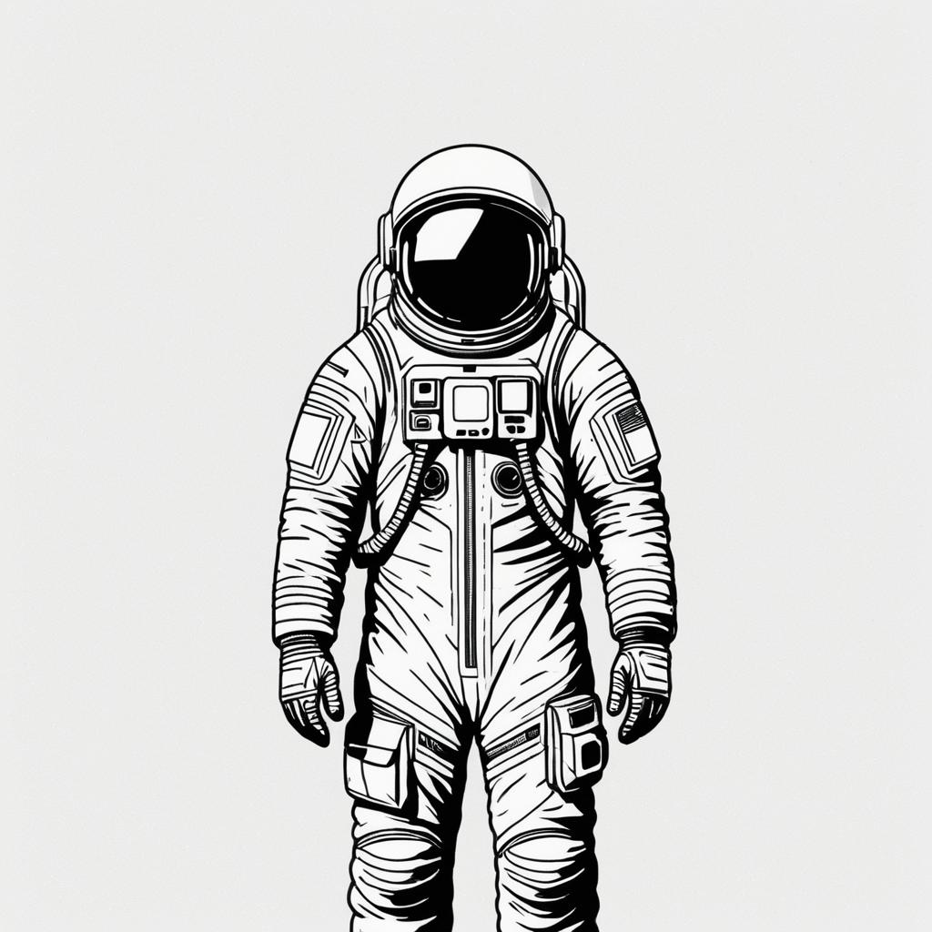 Black and white illustration of a lone astronaut wearing a detailed spacesuit with helmet, life support system, and gloves, depicted with bold outlines and minimalistic style on a plain white background.