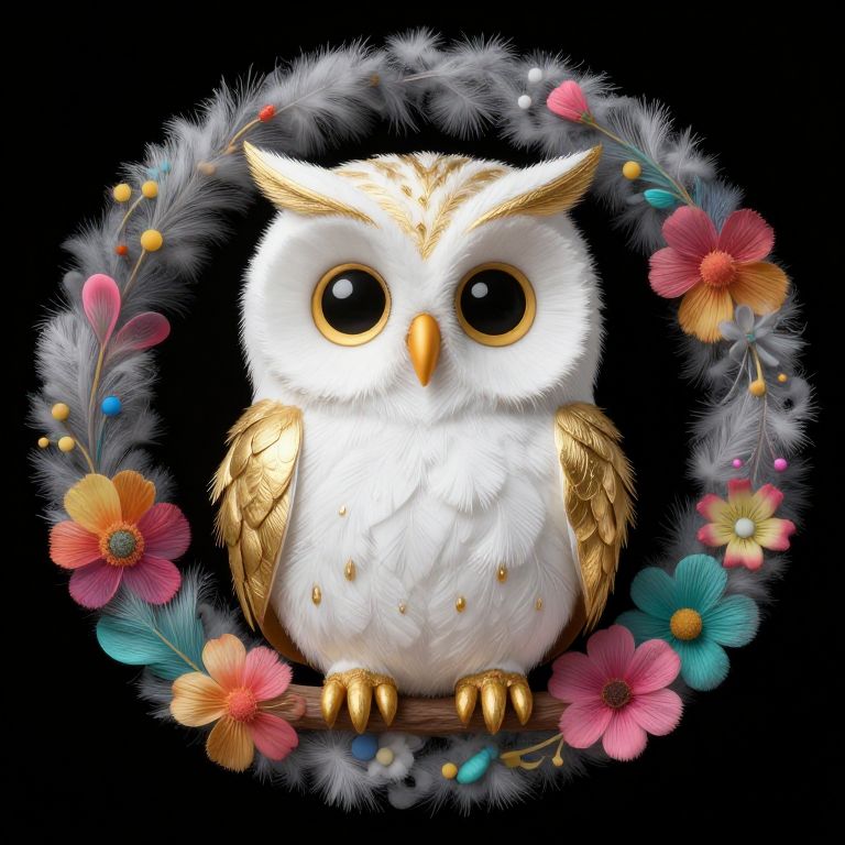 A digital illustration of a cute, fluffy white owl with large, black, shiny eyes and a small, yellow beak. The owl has golden wings and feet, and is centered within a circular floral wreath. The wreath features colorful flowers in pink, red, yellow, and blue, along with delicate, translucent leaves and small, shimmering beads. The background is solid black, making the owl and wreath stand out prominently. The overall style is whimsical and fantasy-like, with a soft, textured look to the owl's feathers and vibrant, detailed flowers.