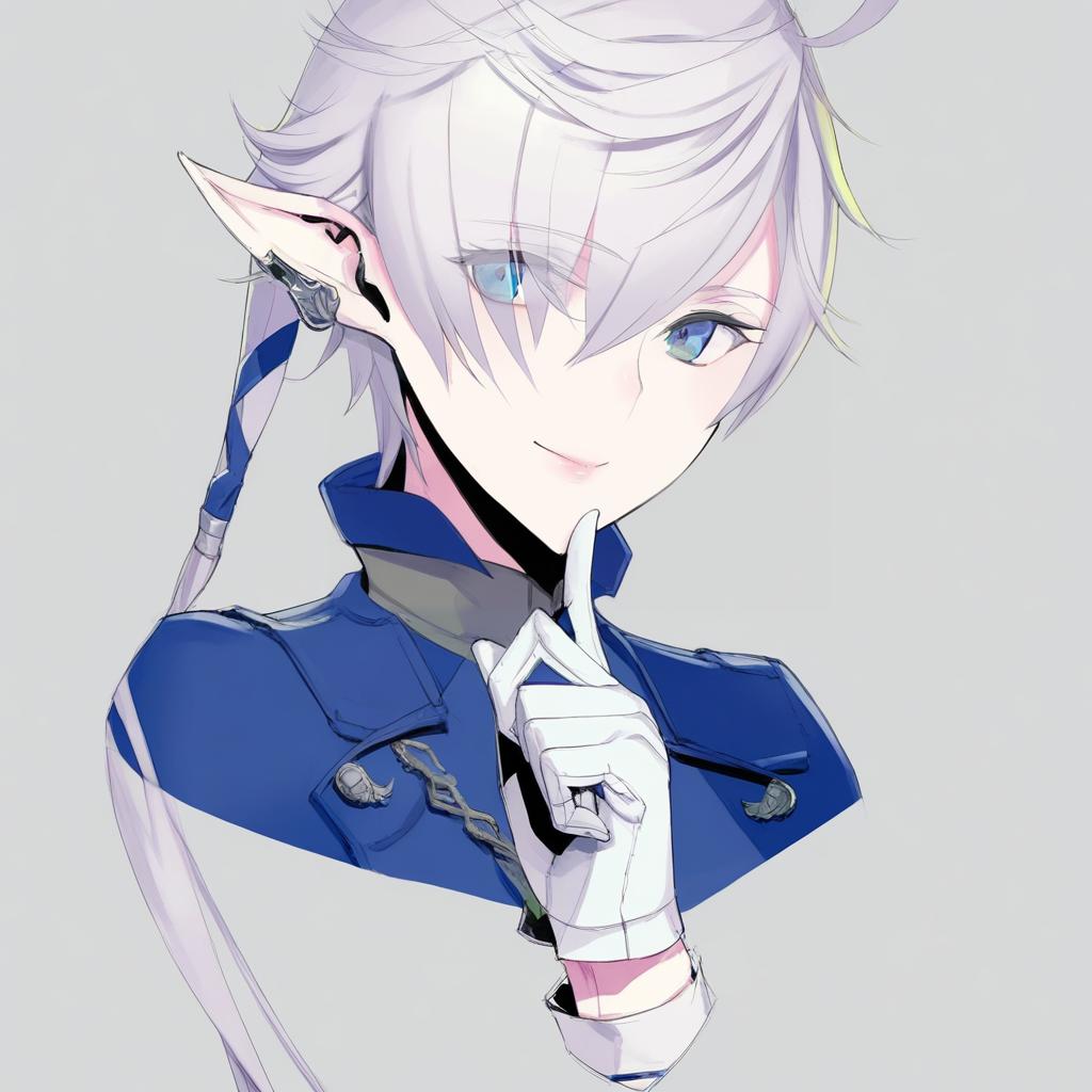Digital anime-style portrait of a male character inspired by Alphinaud Leveilleur from Final Fantasy. The character has white to grey long hair with ahoge, blue eyes, and hair styled over one eye. He wears a blue coat with detailed buttons, white gloves, and a hair ribbon tying his ponytail. Distinctive elf-like ears with ear clips and earrings are visible. The art style is clean and detailed, emphasizing the character's calm expression and fantasy elements.