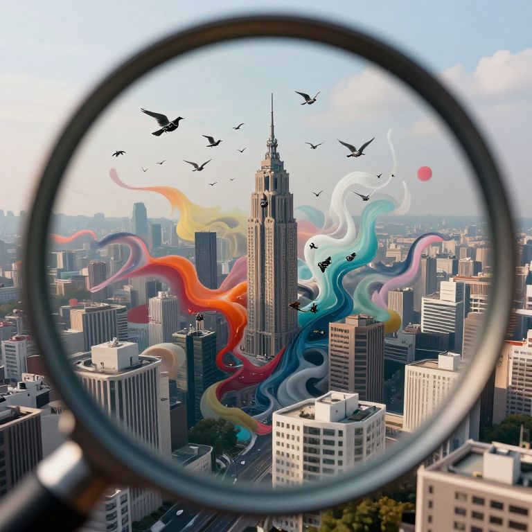 Photograph with digital art overlay of a cityscape viewed through a magnifying glass. The background shows a clear blue sky with scattered clouds and several black silhouetted birds flying above a densely packed urban area featuring tall skyscrapers, including a prominent, central tower with a spire. The magnifying glass distorts the view, adding colorful, swirling, abstract patterns in red, orange, yellow, green, blue, and purple that overlay the buildings. The image combines realism with vibrant, surreal digital art, creating a striking contrast between the city's architectural details and the fluid, colorful shapes.