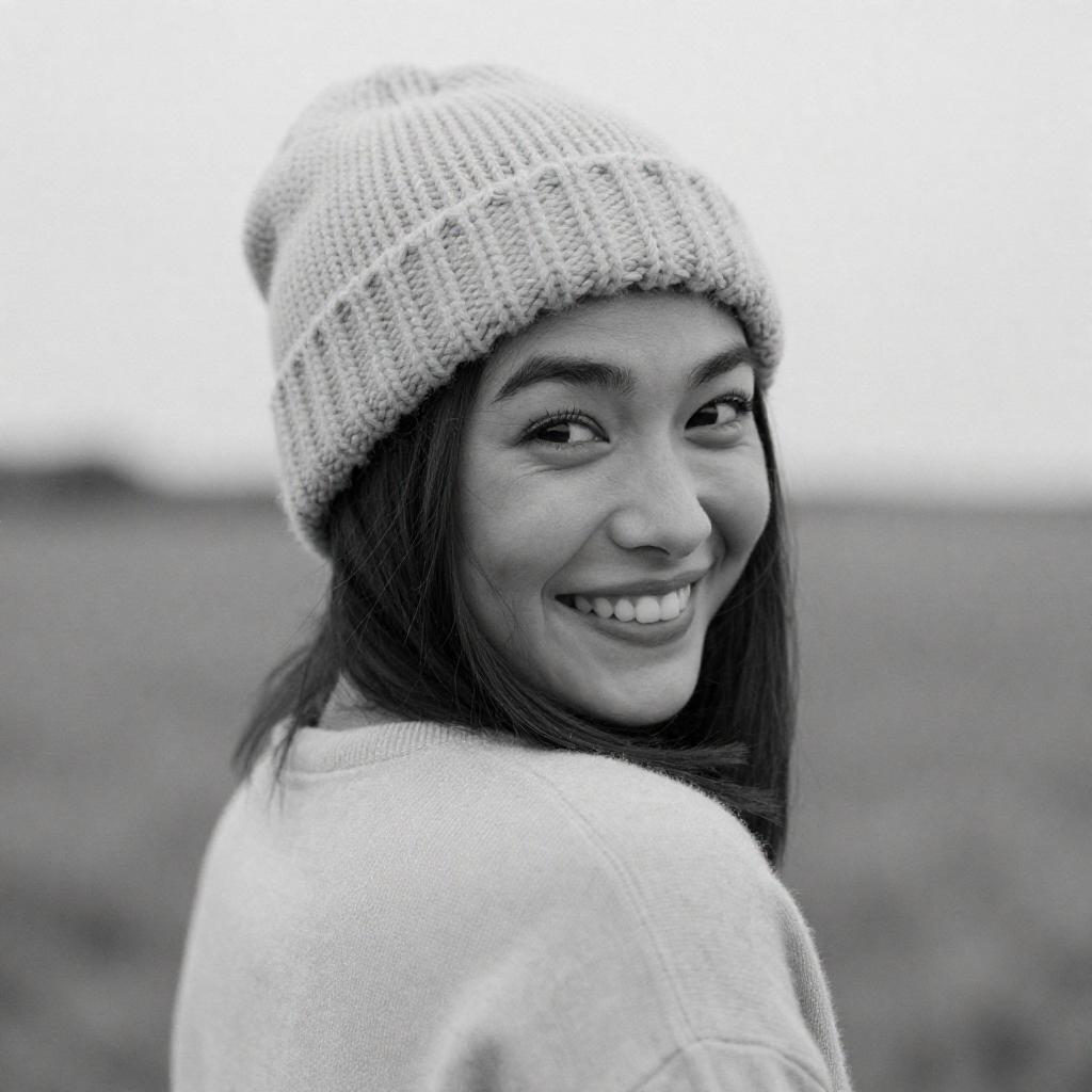Black-and-white photograph of a young woman with a mischievous smile, wearing a knitted hat and a light-colored sweater. She looks over her shoulder to the right, with a blurred, light background. Her dark eyes and playful expression are prominent. The image has a ured, grainy quality.