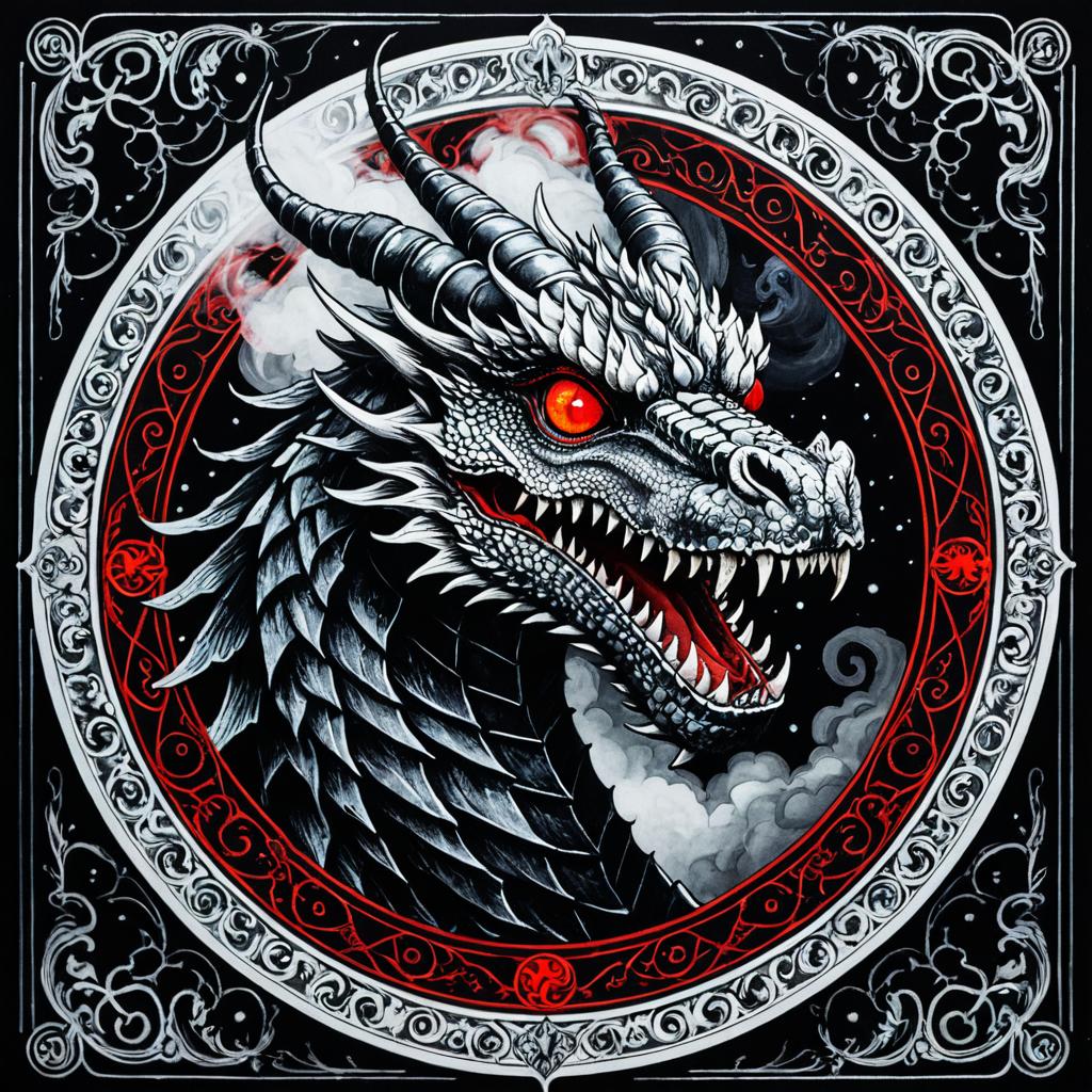 Detailed ink illustration of an antigravity alicorn with glowing red eyes and ornate armor, depicted in a tarot card style. The artwork features swirling fog and phantom elements with a bright silver smoke effect, framed by a baroque and rococo inspired ornate border. It uses a pastel paper and vaporwave color palette with influences from Yoshitaka Amano, Frank Frazetta, and Gustav Klimt, creating a magical and mystical atmosphere.