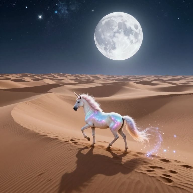 Envision an extraordinary desert panorama with majestic sand dunes undulating under the twin suns of a far-off binary star system, their surfaces glistening in iridescent colors. From a soaring perspective, capture this alien landscape, featuring a lone fantastical creature—a regal centaur adorned with radiant silver wings and eyes that mirror the celestial ballet overhead. The being stands within an ancient stone ring illuminated by otherworldly moonlight, its outline softened by a lively aurora sweeping across the skyline. This expansive image should inspire a profound sense of wonder, merging the stark grandeur of desert vistas with mythical elements to craft a captivating scene that transcends reality and embodies the spirit of cosmic exploration.