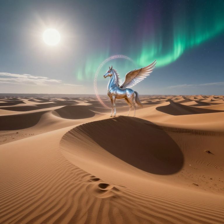 Photograph of a metallic, winged horse with a glowing aura standing on a sand dune under a bright sun and green aurora. Desert landscape