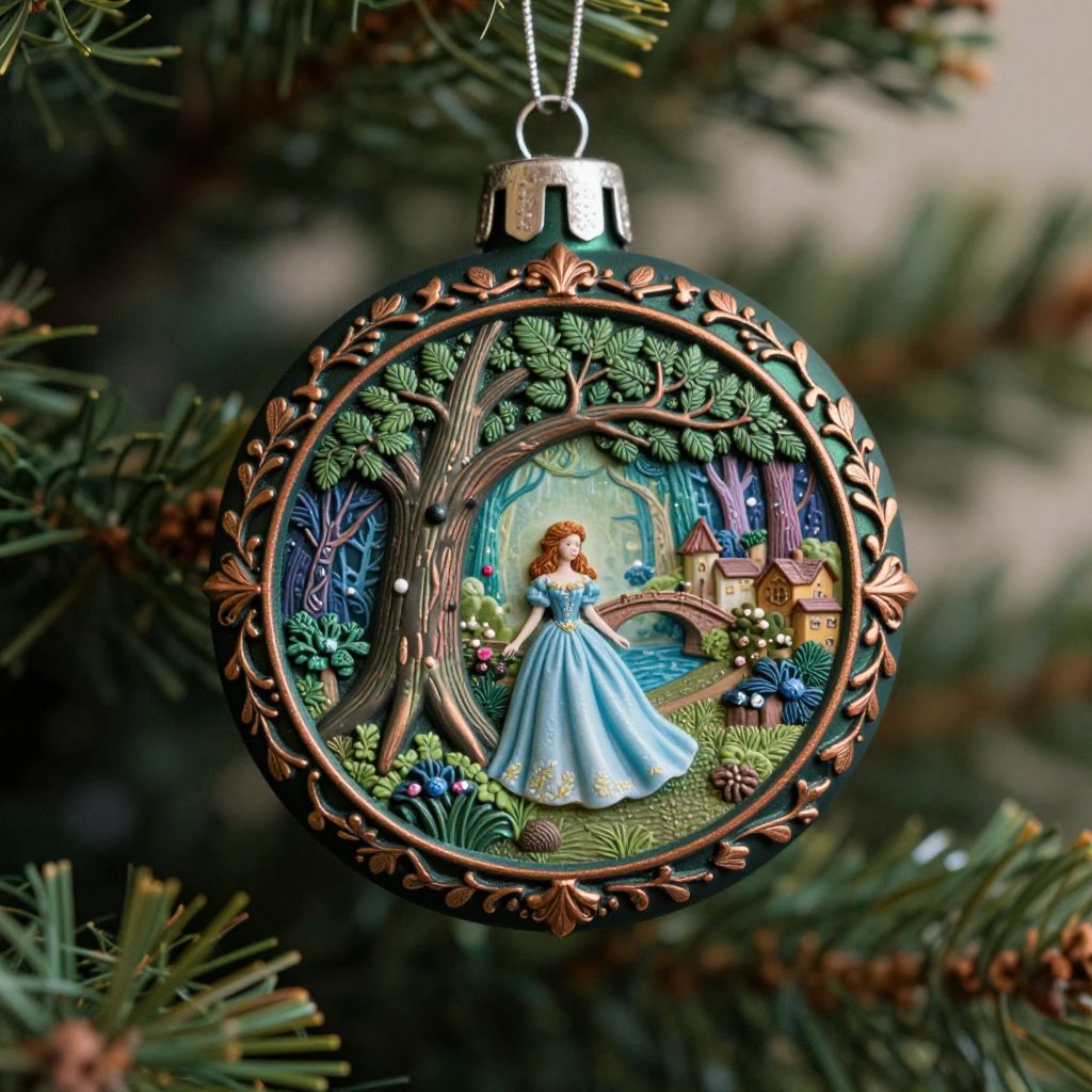 The image showcases a beautifully crafted Christmas tree ornament, reflecting a fairy tale scene within its intricate design. The ornament is suspended from a tree branch, adorned with a rich, dark green hue that complements the festive atmosphere. The central scene depicts a woman in a flowing, light blue dress, standing under a large, detailed tree, surrounded by a whimsical, enchanted forest. The background features a quaint village with buildings and a bridge, adding depth and context to the narrative. The ornament's surface is embellished with ornate, copper-colored patterns, including leaves and vines, enhancing its visual appeal. The interplay of light and shadow within the ornament creates a magical, almost ethereal effect, making the fairy tale scene appear almost three-dimensional. The overall composition is harmonious, with the ornament taking center stage against the blurred backdrop of the Christmas tree, creating a captivating and enchanting visual experience.